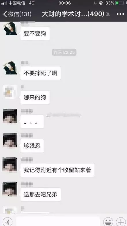 群内大部分是住在大连财经学院男寝的学生,11日深夜摔狗者发布言论后,有人劝其将狗送至附近收留站,得知狗被扔下楼后,大家纷纷谴责其行为。