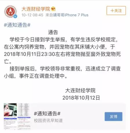 学校于12日接到学生举报,有学生违反学校规定,在寝室内饲养宠物,并因宠物在其床铺大小便,于2018年10月11日23:30左右将宠物抛至窗外致宠物死亡。接到举报后,学校领导非常重视,迅速成立了调查小组,事件正在调查处理中。