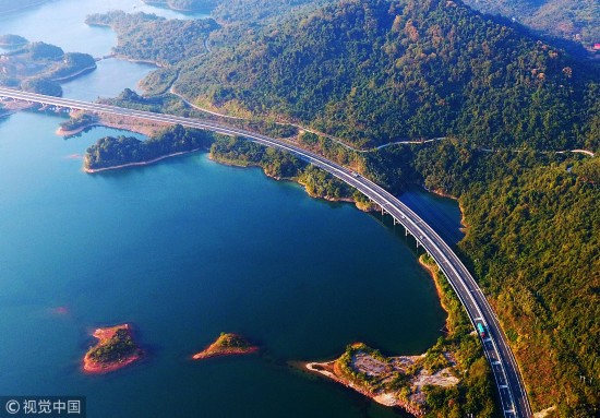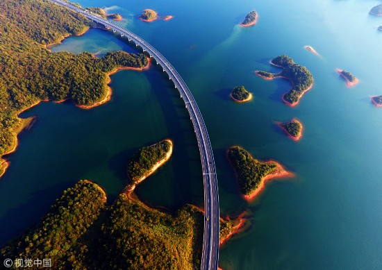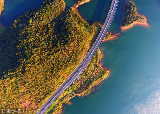 2018年10月12日,蜿蜒在千岛湖中的江西九江的永武高速公路与庐山西海秋意渐浓的植被交相辉映(无人机航拍)。金秋十月,江西庐山西海千岛湖中的植被层岭尽染、秋意渐浓,无人机航拍的镜头下,高速公路蜿蜒在千岛湖中与层岭尽染的植被交织在一起美不胜收,车行路上,如在画中游。