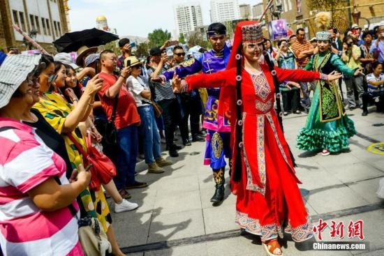 6月12日,位于新疆乌鲁木齐市二道桥的新疆国际大巴扎,身着艳丽服装的演员跳起欢快的舞蹈,吸引大批游客驻足围观。进入6月,中国多个省市开设的旅游专列陆续抵达新疆,游客随旅游专列来到新疆,欣赏新疆独特的自然风光及民风民俗。中新社记者 刘新 摄