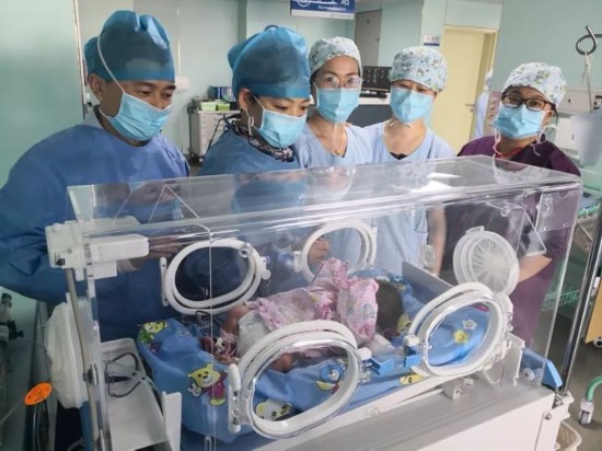 照片里,一个可爱的小宝宝在保温箱内,安稳地睡着了。站在小宝宝身后的五位医护人员,虽然脸上挂着明显的疲惫,但他们看向小婴儿的目光中,却流淌着无限的慈爱与温柔……
