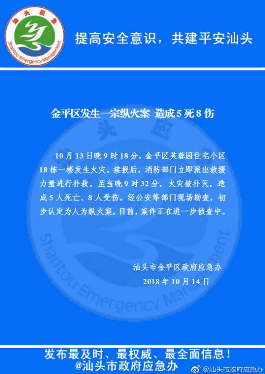 10月13日晚9时18分,广东汕头发生纵火案,造成5人死亡8人受伤。14日,汕头市政府应急办发布通报,全文如下: