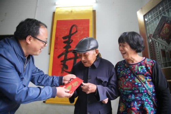 正逢重阳节前夕,坪上镇镇政府工作人员来到清水村看望老人。面对工作人员送来的书法作品和慰问金,97岁老人钟香意老人思维清晰,表达着真诚的谢意:“让你们太费心了,很感谢。也祝你们长命百岁、多子多福。”