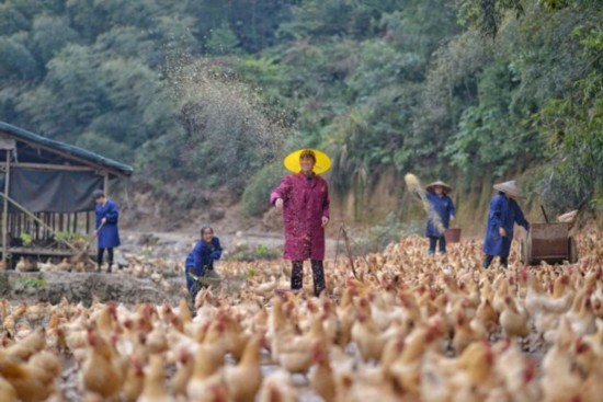 图为在金龙山脉小冲山的生态农庄里,饲养员们正在给鸡喂食。该农庄是坪上镇的重点扶贫产业,农庄的发展带动了庙山村等三个村的闲置劳动力就业。(图文/达明)