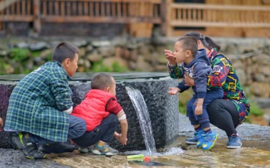 图为孩子们在百岁泉边饮泉水。(图文/达明)