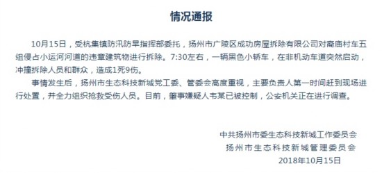 中新网10月15日电 据扬州生态科技新城微信公众号消息,扬州生态科技新城今日发布通报,10月15日,受杭集镇防汛防旱指挥部委托,扬州市广陵区成功房屋拆除有限公司对裔庙村车五组侵占小运河河道的违章建筑物进行拆除。上午7时30分左右,一辆黑色小轿车,在非机动车道突然启动,冲撞拆除人员和群众,造成1死9伤。