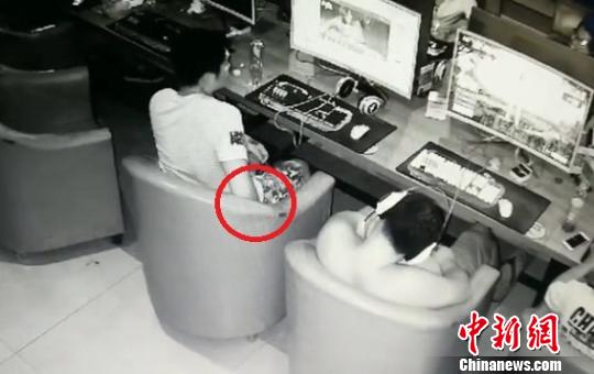 图为:行窃男子将他人手机挪到自己桌上。浙江省天台县公安局供图