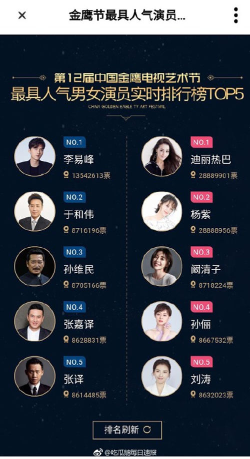 在29届中国电视金鹰奖中,杨紫不负众望提名了观众喜爱女演员奖。尤其是在金鹰节最具人气女演员观众投票的第二阶段,杨紫和迪丽热巴的排名一直交替,票数相差无几。