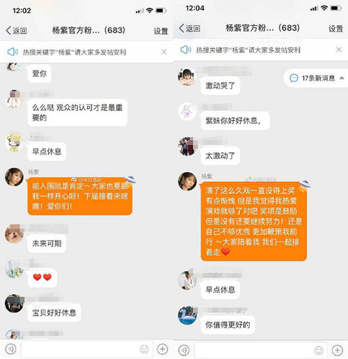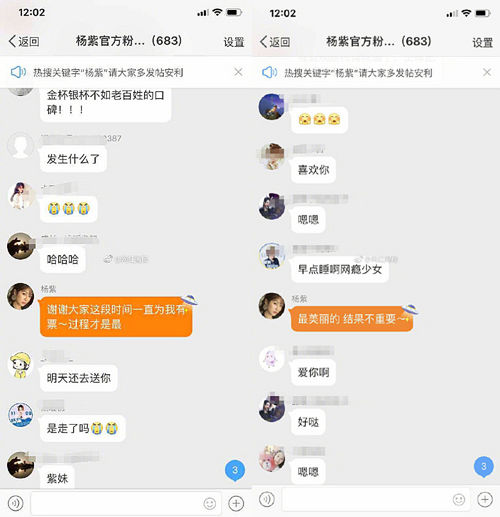 10月14日深夜,杨紫空降官方粉丝群与粉丝互动,让所有粉丝惊喜万分。先是跟所有粉丝打招呼,并为粉丝给自己金鹰节投票表示感谢:“谢谢大家这段时间一直有为我投票,过程才是最美丽的,结果不重要。”后面谦虚表示:“能入围就是肯定,下届接着来嘿嘿。”