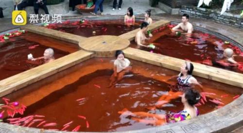10月12日,重庆市沙坪坝某景区打造了一款装修成四宫格火锅的“红汤”温泉池,里面还有一些白菜辣椒等道具。很多人来泡,大家说感觉新颖,似乎还有辣辣的味道,并表示:泡完更想吃火锅了!