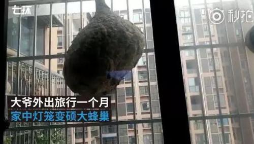 最近,四川成都新都区的郭大爷,外出旅游一个月后回家。发现阳台悬挂的灯笼,变成了80公分左右的蜂巢。大爷报警求助,消防用编织袋将蜂巢收入袋中成功摘除。