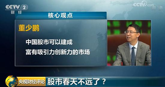 证券日报社常务副总编辑 董少鹏:我们的经济在全球排第二,我们的贸易包括出口等都是很强的一个主体,在科技创新方面还有更大的发展空间,但是资本市场和实体经济匹配程度比较弱,去年提过建立强化资本市场,由于三去一降一补和中美贸易摩擦不期而遇,导致市场目前比较低迷,但我们要通过努力把中国的股市建成富有创新力、吸引力的强大市场,现在把形势看得比较清楚了,要采取什么措施也是比较清楚的,通过下一阶段努力我相信春天的来临就意味着我们有吸引力、有强大投资价值的股市就会建立起来。