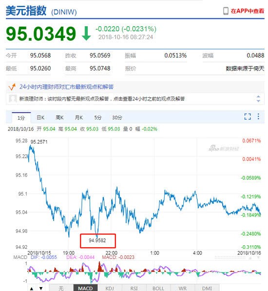 美国经济数据意外低迷的表现更令美元指数一度承压失守95关口。素有“恐怖数据”之称的美国零售数据报告显示,9月美国零售销售增幅仅有0.1%,远低于预期的0.6%,且扣除燃料和食品的核心零售销售数据更是出现0.1%的负增长。这一状况令投资者在第一时间大跌眼镜。美国股市也在早盘承压低开。
