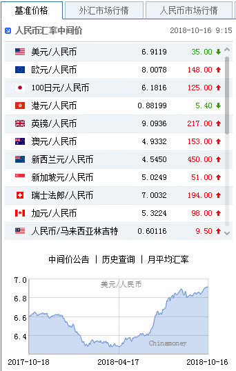 10月16日,人民币中间价上调35点报6.9119,上一交易日中间价6.9154;上一交易日官方收盘价报6.9270,上一交易日夜盘收盘报6.9134。