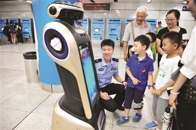 南京市公安局地铁分局智能警务机器人亮相南京新街口地铁站,为群众提供查询引路、一键报警等。