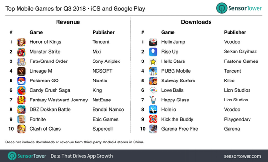 根据Sensor Tower出炉的2018年Q3季度移动应用市场分析报告显示,苹果谷歌两大商店消费总支出达到182亿美元,同比增长22.7%,而在全球手游收入榜排名中,《王者荣耀》依然排名第一。