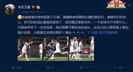 在比赛后进行自我总结,已经成为王霜的一种习惯。法甲首秀,王霜打进了一记世界波并制造了一粒点球,帮助巴黎女足5-1大胜同城对手巴黎FC,那天夜晚,王霜写下了“好的开端很重要”的感慨。欧冠首秀登场献出助攻,王霜给自己的表现打了个及格分,“还没有把自己真正的实力发挥出来”,在结束欧冠客场星夜返程的路上,王霜写下总结,“首发满场,值得纪念,一场比一场好,还能更好。”