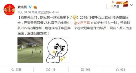 中国姑娘王霜的优秀表现还赢得了《紫光阁》的点赞,中央和国家机关工作委员会《紫光阁》杂志社在社交媒体上写道:“抱歉先生们,欧冠第一球我先拿下了,2018-19赛季女足欧冠1/8决赛首回合,巴黎圣日耳曼VS林雪平的比赛中,女足王霜在80分钟打入一球,帮助球队以2-0获得胜利,她也成为了中国第一个在欧冠中进球的球员!网友:原以为去深造,没想到是支教!”