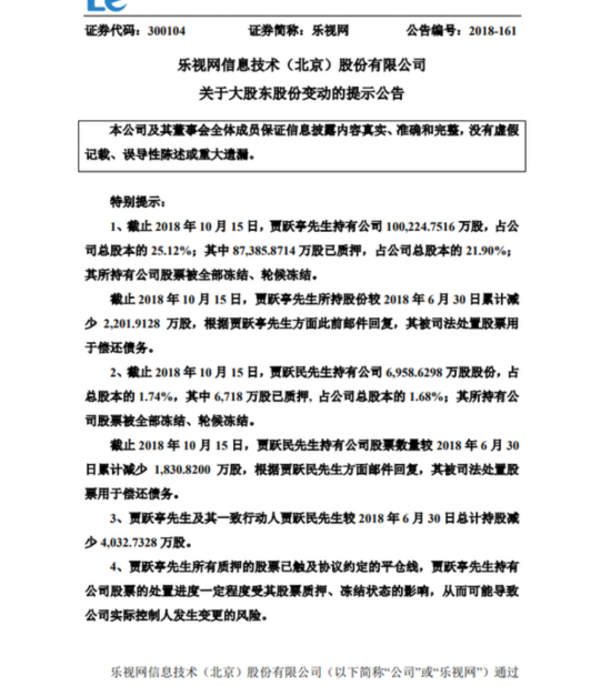 公告称,截止2018年10月15日,贾跃亭先生持有公司 100,224.7516 万股,占公司总股本的 25.12%;其中 87,385.8714 万股已质押,占公司总股本的 21.90%;其所持有公司股票被全部冻结、轮候冻结。