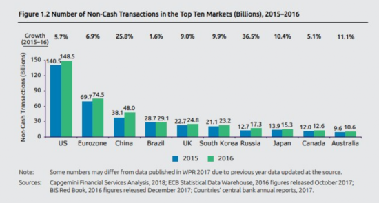 据了解,该研究依据的是世界银行、国际结算银行和欧洲央行统计数据库的数据。统计非现金交易数量时包括了支票、借记卡、信用卡支付、信用转账和直接借记交易。《2018年世界支付报告》由咨询和技术服务公司凯捷(Capgemini)与欧洲主要银行巴黎银行(BNP Paribas)联合编制。