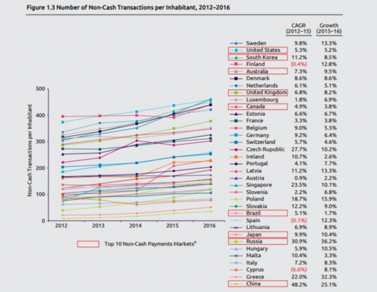 报告显示,在人均次数方面,瑞典超越了美国成为了人均非现金支付次数最多的国家。瑞典人在统计期内平均进行了461.5次电子交易,较前一年增长了13%;美国人人均进行459.6次电子交易,较瑞典少1.9次,增长率方面则仅为5.2%。报告预计,瑞典将会继续维持高速增长,在短期内继续保持在非现金支付国家的首位。