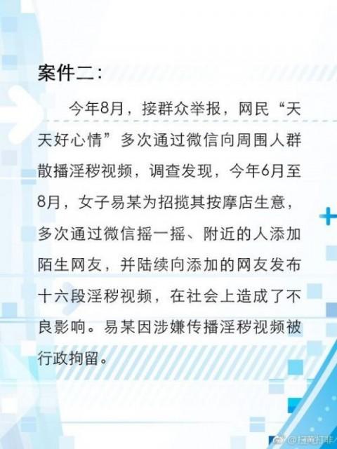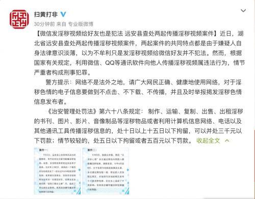10月18日消息,全国“扫黄打非”办公室官方微博今日披露了湖北省远安县查处的两起传播淫秽视频案件,两起案件的共同特点都是由于嫌疑人自身法律意识淡薄,以为不牟利只是发淫秽视频给微信好友并不犯法。然而,根据国家有关规定,利用微信、QQ等通讯软件向他人传播淫秽视频属违法行为,情节严重者构成刑事犯罪。
