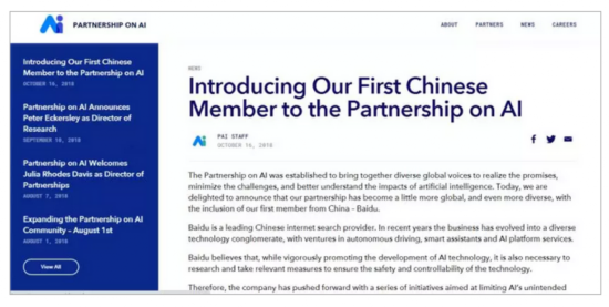 据环球网科技此前报道,美国非营利组织Partnership on AI在最新公告中欢迎首位中国新成员百度加入,并称此次合作是“建立一个真正全球性合作机构的重要一步”。