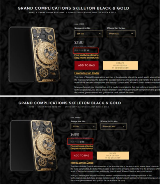 GRAND COMPLICATIONS奢华定制版iPhoneXs和iPhone Xs Max的可活动机械手表需要手动上芯,最便宜的版本256G的钛金 iPhone XS定制版售价6320美元,与之对比苹果官方的256G iPhone XS售价1149美元;512G iPhone XS Max黄金版则售价8080美元,需要预付4040美元开始定制。