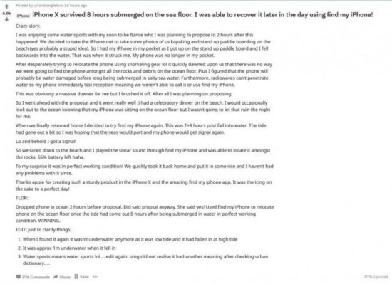 大约8小时后,海水退潮,两人重拾希望,终于借助Find My iPhone的播放提示音功能在岩石间找到了iPhone X,当时它的剩余电量还有66%。网友称拿到手后就立即关机,赶回家扔到大米中,现在是完好如初,没有任何副作用。