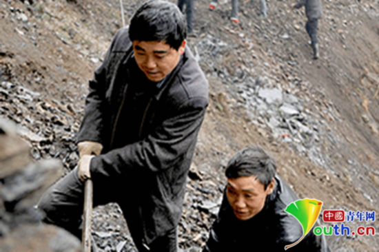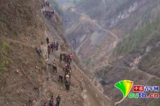 绵延不断的深山,蜘蛛般悬挂的汉子,枯裂如松皮的双手,沾满泥土的鞋袜,像极了寓言故事里的“愚公移山”,这一幕真真实实地发生在湖北店子坪村的悬崖绝壁上。