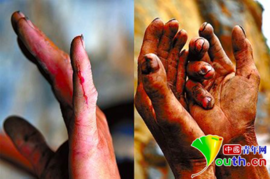 因长期修路而枯裂的双手。资料图