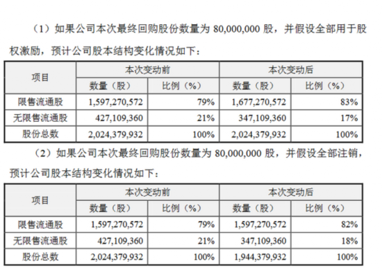 巨人网络表示,若全额回购,预计回购股份总数不低于80,000,000股(含),占公司目前已发行总股本的比例约为3.95%,占公司目前无限售条件股份的比例约为18.73%。具体回购股份的数量及占公司总股本及无限售条件股份的比例,最终以回购期满时公司实际回购的股份数量和占公司总股本及无限售条件股份的比例为准。
