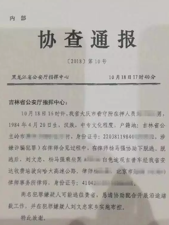 10月19日,网上流传一份黑龙江省公安厅协查通报引发广泛关注。其中显示,在律师杨马强帮助下,一涉嫌诈骗犯罪的在押人员刘文忠从大庆市看守所脱逃。