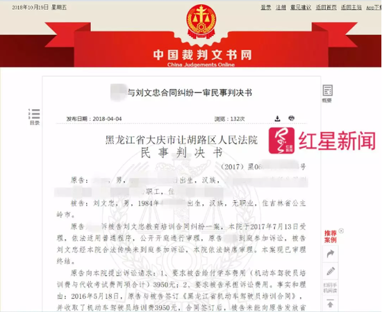 根据其中一份今年4月4日由黑龙江省大庆市让胡路区人民法院发布的民事判决书显示,刘文忠曾是大庆市中文机动车驾驶员培训学校(以下简称中文驾校)的法定代表人,后因刘文忠降价抵账给他人,导致学员缴纳了学车培训费后,无法完成驾驶课程。