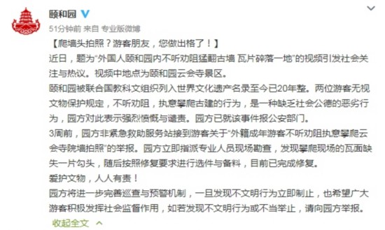 颐和园园方在回应中表示,将进一步完善巡查与预警机制,一旦发现不文明行为立即制止,也希望广大游客积极发挥社会监督作用,如若发现不文明行为或不当举止,请向园方举报。