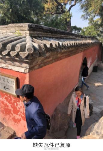 据介绍,3周前,园方非紧急救助服务站接到游客关于“外籍成年游客不听劝阻执意攀爬云会寺院墙拍照”的举报。园方立即指派专业人员现场勘查,发现攀爬现场的瓦面缺失一片勾头,随后按照修复要求进行选件与备料,目前已完成修复。