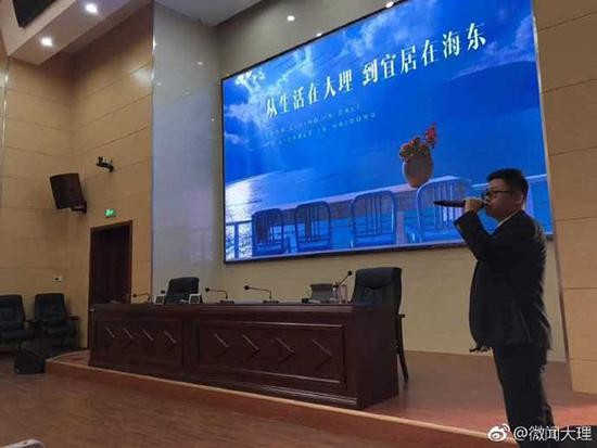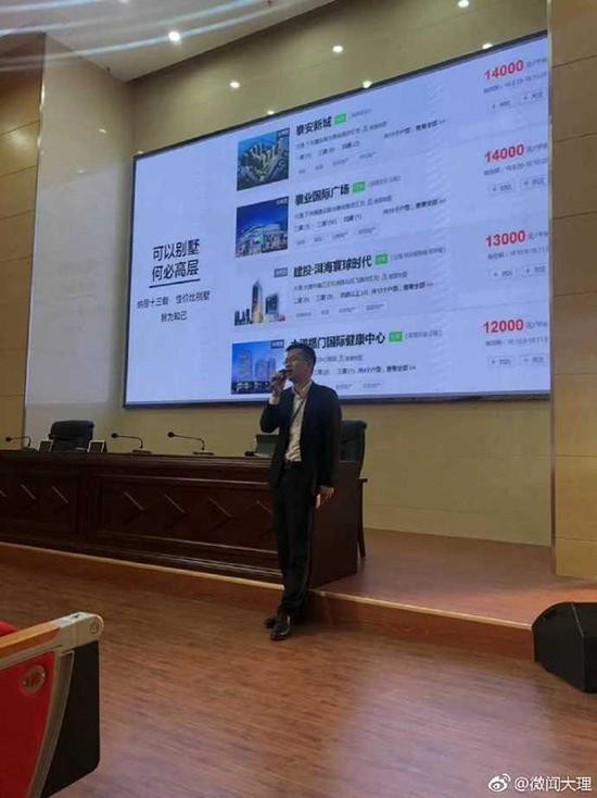@微闻大理 在其微博贴出的图片显示,电子显示屏顶部背景标题为“滇西应用技术大学宪法宣讲活动”,但电子显示屏中的内容则为大理一地产项目的广告标语“可以别墅 何必高层”和该楼盘的价格、楼盘草图等内容,现场还有工作人员拿着话筒讲话。微博中另一张附图内容,是名为“十畝地产李江”的网友在其朋友圈发文称,感谢滇西大学领导和老师大力支持,海岸春天二期专场推介会圆满成功,现场咨询、报名火爆。
