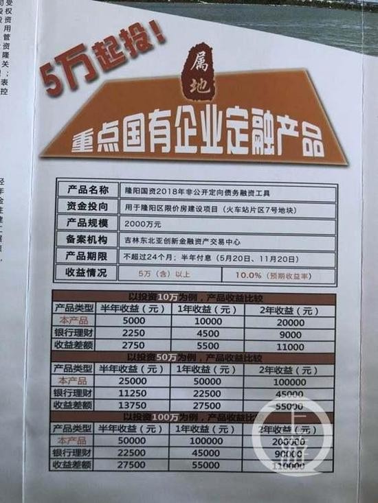 记者了解到,这次涉事的产品名为“隆阳国资2018年非公开定向债务融资工具”,资金投向主要为隆阳区火车站片区7号地块的限价房建设,融资规模2000万元,产品期限24个月,预期收益率10%。根据下方的测算资料显示,10%为这一产品的年化收益率。