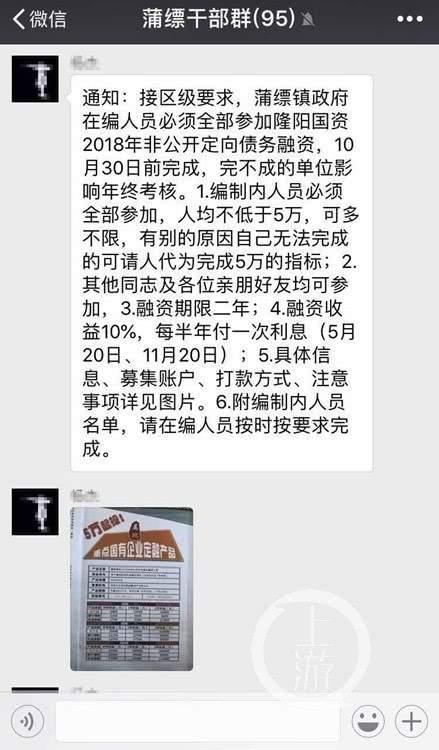 10月19日,云南知名大V@烟云 在微博上发布了名为“浦缥干部群”的微信对话截图显示,称云南保山隆阳区发布通知,要求编内人员必须全部参与隆阳国资2018年非公开定向债务融资,10月30日前完不成任务单位将影响年终考核。
