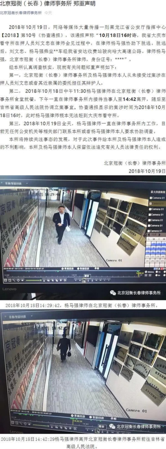 2018年10月19日,网络等媒体大量传播一则黑龙江省公安厅指挥中心【2018】第10号《协查通报》,该通报声称“10月18日16时许,我省大庆市看守所在押人员刘文忠在律师会见过程中,在律师杨马强协助下脱逃。脱逃后,刘文忠、杨马强乘坐**车经我省安达收费站驶向哈大高速公路。律师杨马强,北京市冠衡(长春)律师事务所律师,身份证号:****”。