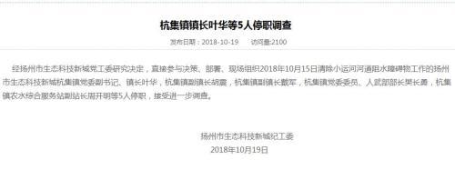 针对此事件,扬州市生态科技新城管委会网站今晚发布通报称,经扬州市生态科技新城党工委研究决定,直接参与决策、部署、现场组织2018年10月15日清除小运河河道阻水障碍物工作的扬州市生态科技新城杭集镇党委副书记、镇长叶华,杭集镇副镇长胡震,杭集镇副镇长戴军,杭集镇党委委员、人武部部长樊长勇,杭集镇农水综合服务站副站长周开明等5人停职,接受进一步调查。