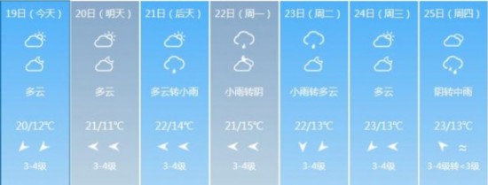 据市气象台最新消息,未来一周,我市气温大致仍保持在10℃至22℃。具体来说,今天至下周五最高气温稳定在21℃至23℃;不过最低温度将经历一个波折,19日至23日呈上升趋势,23日(下周二)最低气温达15℃。可能是受霜降节气的影响,24日、25日的最低气温将略微下降,回到13℃。