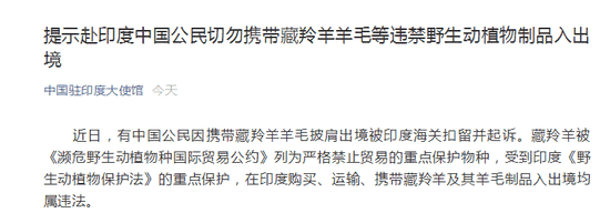 20日,中国驻印度大使馆也发文提醒,赴印度中国公民切勿携带藏羚羊羊毛等违禁野生动植物制品入出境。