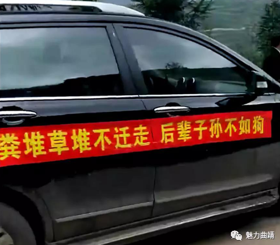 10月20日晚间,北京时间记者与发文者取得联系,据其透露,这些诅咒式标语是富源县墨红镇补木村村委会制作的。记者遂联系当地人进行求证,在补木村开煤矿的陈某称,曾见村民在微信里发过;补木村村民李某则称,标语就贴在村干部的轿车上,是昨天上午贴上去的,今天不见了。其气氛地表示,这是“黑社会行径”,“文明社会怎么能这样搞!”