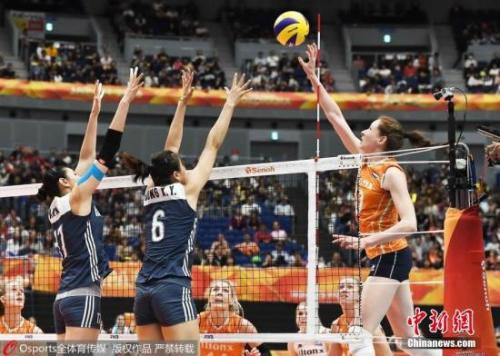 本次大赛中国女排的一传和发球都有提高。图为赛场上女排队员拦网。