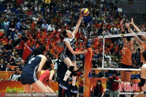 大赛中,中国队的边攻不尽如人意,还有待提高。图为中国队员扣球