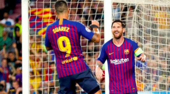 (梅西和苏亚雷斯庆祝进球)