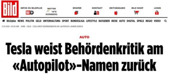 2016年,德国政府要求特斯拉停止使用Autopilot一词,认为这是“误导”消费者。当时的德国交通部长还致函特斯拉,指出这一术语“具有误导性”,并且要求“避免误解和虚假的客户期望”,特斯拉当时强硬回应,不会改名,司机在使用Autopilot必须跟踪和控制车辆。