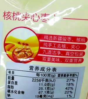 李先生称,自己在一家超市买了5袋某品牌的核桃夹心枣。他平时有个习惯,吃东西前都会对产品标签内容看了又看,将使用说明研究透彻了才会放心吃,结果这次看出一个大大的“bug”。核桃夹心枣的产品标签上除了标注生产厂家、商标、品名等外,还标有营养成分表:每100克含蛋白质11克、脂肪25.1克、碳水化合物67.1克……