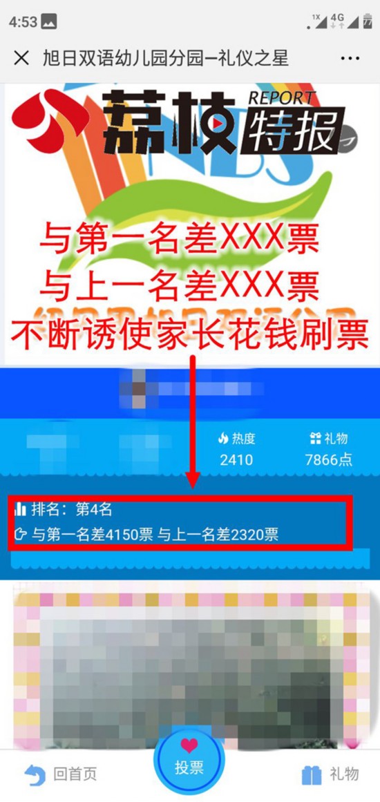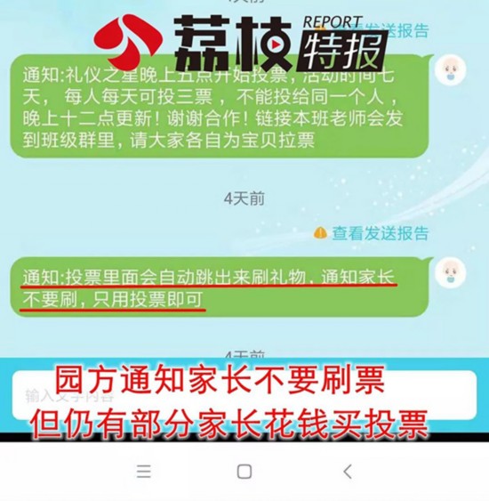 对于这样的做法,采访中家长们认为,尽管幼儿园嘴上说着不让家长刷票,却又开放刷票通道,同时,小程序内部也不断使用“锁定投票”、“距离前一名次还差XX票”等手段,涉嫌诱使家长、亲友不断花钱刷票……一位家长表示,投票平台方正是利用了家长们好面子、好攀比的心理,牟取暴利。